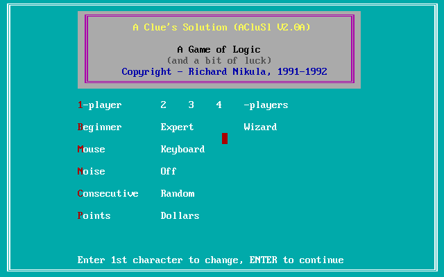 "A Clue's Solution" is a puzzle game released for DOS in July of 1993, developed by Richard Nikula.